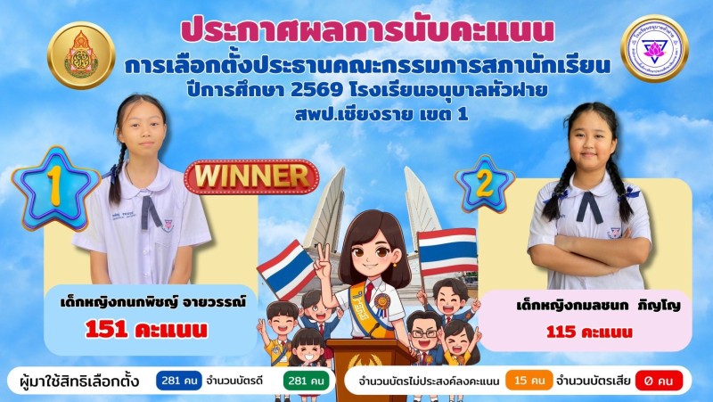วันพุธ ที่ 4 มีนาคม พ.ศ.2569 นายอำนาจ ธิโนชัย ผู้อำนวยการโรงเรียนอนุบาลหัวฝาย ใอบหมายให้นายกรวิชญ์ สุทธิธัญญะลักษณ์ หัวหน้างานประชาธิปไตยในโรงเรียน ดำเนินการจัดกิจกรรมการเลือกตั้งประธานคณะกรรมการสภานักเรียน ประจำปีการศึกษา 2569 ณ ใต้ถุนอาคาร 85 ปีหัวฝายนุสรณ์ โรงเรียนอนุบาลหัวฝาย โดยมีพรรคที่สมัครจำนวน 2 พรรค มีผู้มาใช้สิทธิ์ในการเลือกตั้งจำนวน 281 คน เลือกตั้งโดยใช้ โปรแกรม Erection vote (เลือกตั้ง) ในระบบ School master เพื่อส่งเสริมให้นักเรียนมีความรู้ ความเข้าใจ ในระบอบการปกครองประชาธิปไตย เข้าใจบทบาทหน้าที่ของตนเอง ส่งเสริมภาวะความเป็นผู้นำและกล้าแสดงออก และการใช้เทคโนโลยีให้เกิดประโยชน์สูงสุด โดยผู้ที่ชนะการเลือกตั้งได้แก่ หมายเลข 1 เด็กหญิงกนกพิชญ์ จายวรรณ์