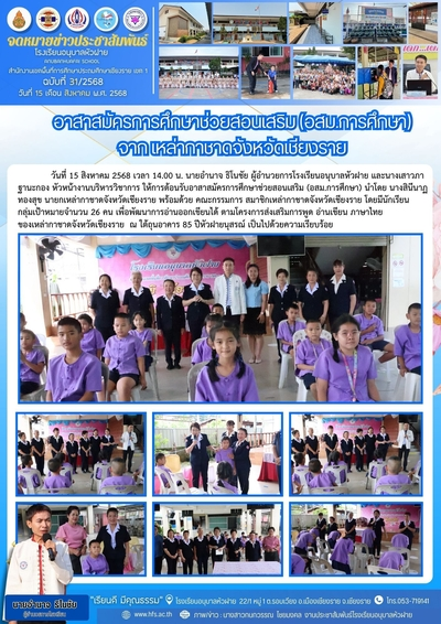 ฉบับที่ 31/2568 วันที่ 15 ส.ค. 68 อาสาสมัครการศึกษาช่วยสอนเสริม (อสม.การศึกษา) จากเหล่ากาชาดจังหวัดเชียงราย