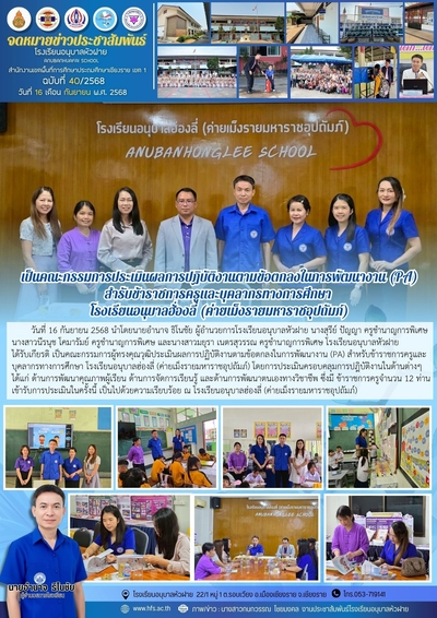 ฉบับที่ 40/2568 วันที่ 16 ก.ย. 68 เป็นคณะกรรมการประเมินผลการปฏิบัติงานตามข้อตกลงในการพัฒนางาน (PA)ฯ โรงเรียนอนุบาลฮ่องลี่ฯ