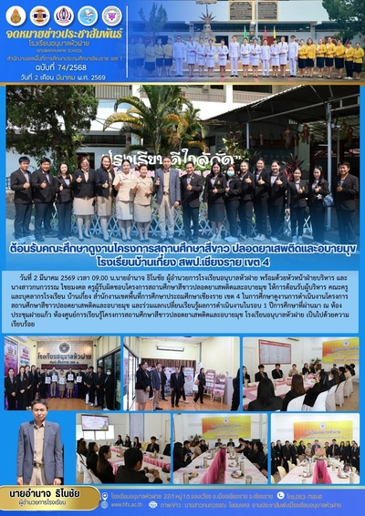 ฉบับที่ 74/2568 วันที่ 2 มี.ค. 69 ต้อนรับคณะศึกษาดูงานโครงการสถานศึกษาสีขาว ปลอดยาเสพติดและอบายมุข โรงเรียนบ้านเกี๋ยง สพป.ชร.เขต 4