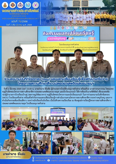 ฉบับที่ 75/2568 วันที่ 2 มี.ค. 69 ร่วมลงนามบันทึกข้อตกลง (MOU) และแลกเปลี่ยนเรียนรู้ เพื่อพัฒนาเครือข่าย โครงการสถานศึกษาสีขาวปลอดยาเสพติดและอบายมุข