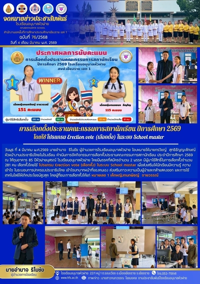 ฉบับที่ 76/2568 วันที่ 4 มี.ค. 69 เลือกตั้งประธานคณะกรรมการสภานักเรียน ปีการศึกษา 2559